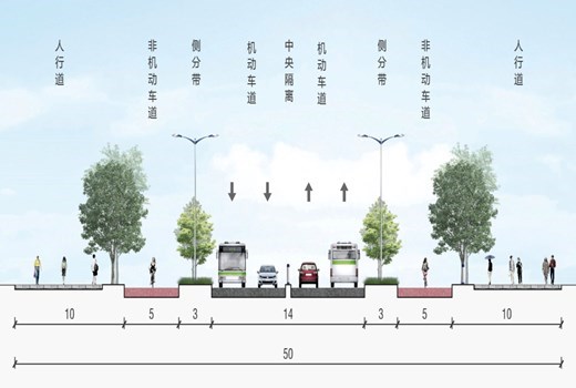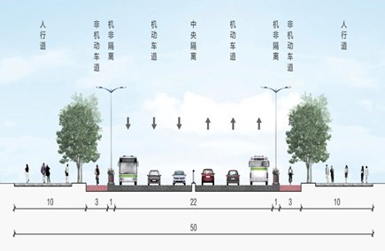 方案二:縮窄綠化帶與慢車道寬度,主車道拓寬為雙向六車道斷面形式,對交叉口展寬渠化,提升通行效率。