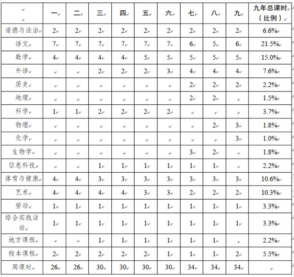 一至二年級每周26課時,三至六年級每周30課時,七至九年級每周34課時,九年新授課總課時數為9522。小學每課時按40分鐘計算,初中每課時按45分鐘計算。