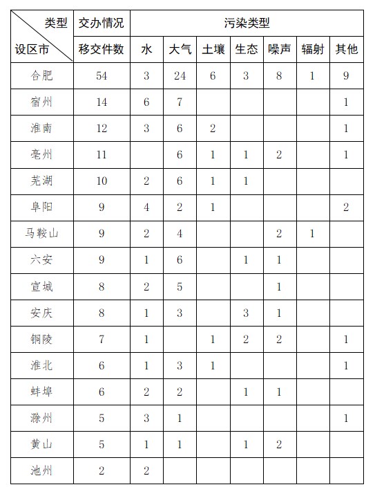 截至11月20日9時,我省收到中央第二生態環境保護督察組轉辦的第三十一批群眾信訪舉報件175件,涉及環境問題175個。其中,大氣環境問題76個、水環境問題34個、噪聲問題20個、其他污染問題17個、土壤問題13個、生態問題13個、輻射問題2個。第三十一批轉辦信訪件涉及16個地市,分別是:合肥市(54件)、宿州市(14件)、淮南市(12件)、亳州市(11件)、蕪湖市(10件)、阜陽市(9件)、六安市(9件)、馬鞍山市(9件)、安慶市(8件)、宣城市(8件)、銅陵市(7件)、淮北市(6件)、蚌埠市(6件)、滁州市(5件)、黃山市(5件)、池州市(2件)。