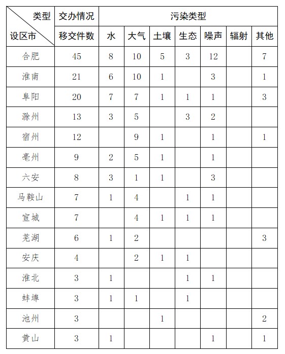 截至11月21日9時,我省收到中央第二生態環境保護督察組轉辦的第三十二批群眾信訪舉報件164件,涉及環境問題164個。其中,大氣環境問題60個、水環境問題34個、噪聲問題27個、其他污染問題18個、土壤問題13個、生態問題12個。第三十二批轉辦信訪件涉及15個地市,分別是:合肥市(45件)、淮南市(21件)、阜陽市(20件)、滁州市(13件)、宿州市(12件)、亳州市(9件)、六安市(8件)、馬鞍山市(7件)、宣城市(7件)、蕪湖市(6件)、安慶市(4件)、淮北市(3件)、蚌埠市(3件)、池州市(3件)、黃山市(3件)。
