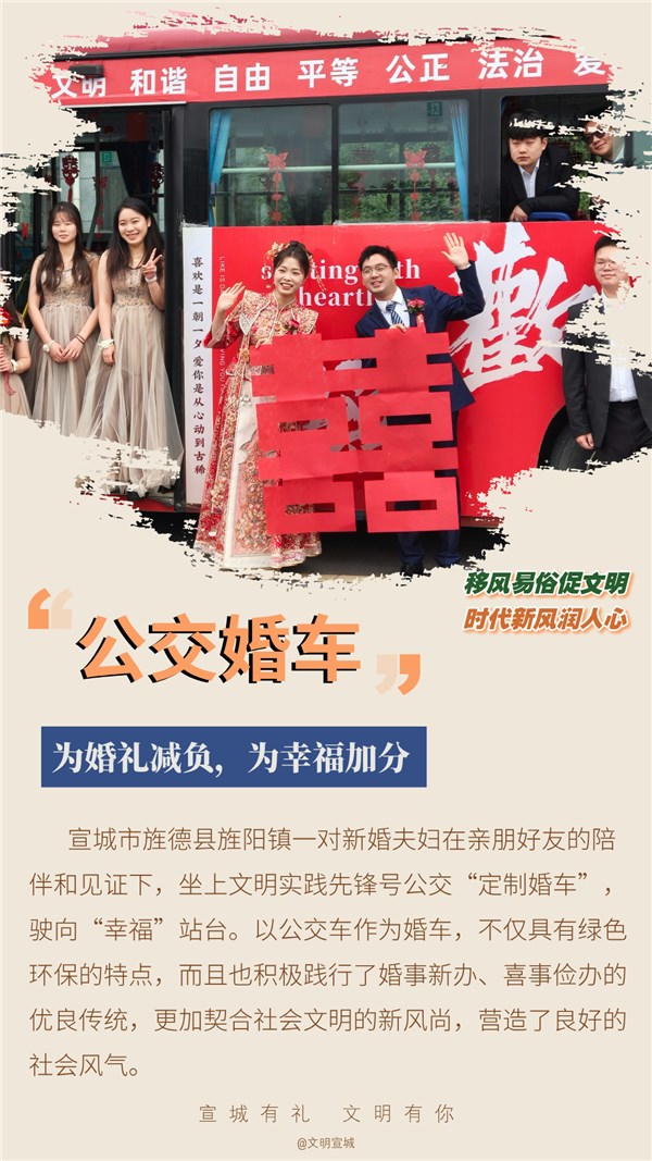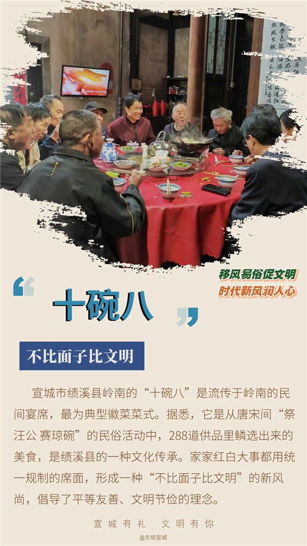文明鄉風,移風易俗是關鍵,在宣城,百家宴同享幸福味,公交婚車為婚禮減負,“喜事新辦”減錢不減情“十碗八”不比面子比文明……擇善而從,新風漸起,讓我們從海報中一起解鎖移風易俗“宣城實踐”。