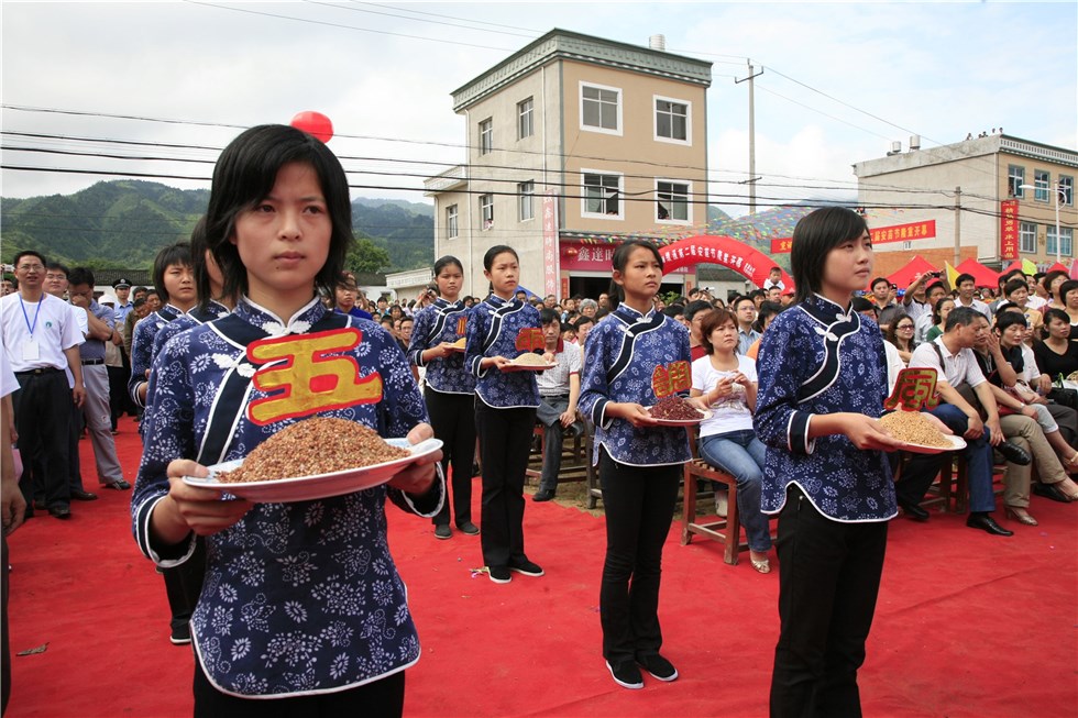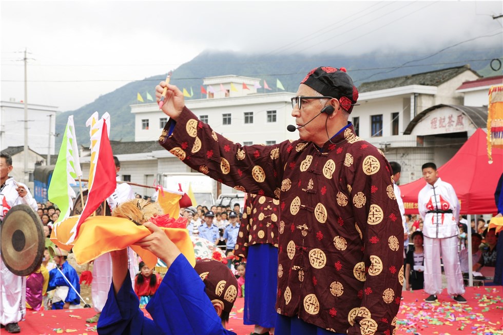 安苗節,就這樣誕生了。安苗節流行于績溪縣一帶,在芒種后,全村水稻栽插完畢,稻禾長勢初定時,由村中長老、士紳擇定一個“龍”(辰)日或“虎”(寅)日舉行。是日晨,在村前場坦或河灘設祭壇,從大廟請出黑(臉)太尉、紅(臉)太尉登祭臺,祭臺圍插旗幡,除有常備的錦緞三角大旗外,必有節前用綿紙拼制成的方形大旗四或八面,上書“風調雨順、國泰民安、五谷豐登”大字,每面旗上只書一字,并配畫圖案。祭臺前擺香案,置香爐、燭臺,供村戶敬貢祭拜。