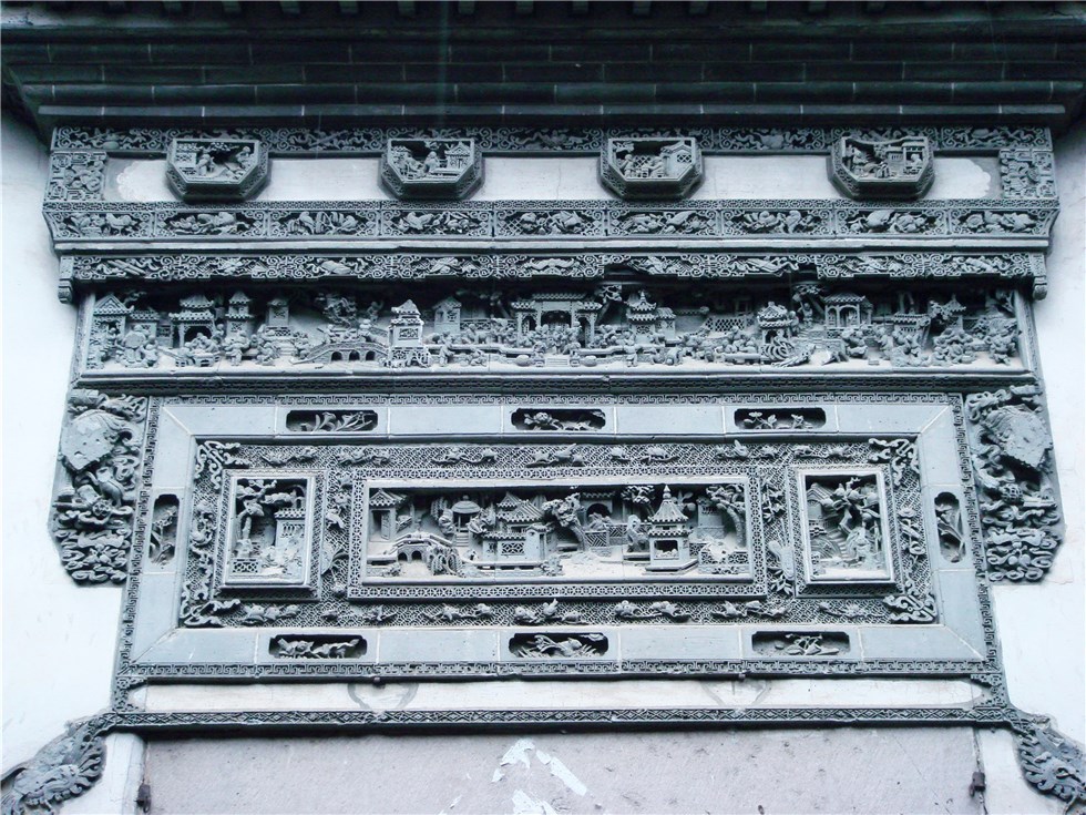 徽州三雕(木雕、磚雕、石雕)藝術善于處理原材料本色,既能巧妙地溶化在建筑物整體之中,又能獨立一格,相映成趣。徽州三雕,清新淡雅,磚雕制作材料為特制的水墨青磚,用各種刀具在磚胚上雕刻后,入窯燒制;石雕選用的是當地的青石、粗麻石、大理石等,主要用于墻基、柱礎等部位;其木雕藝術更為古色古香,用材講究、布局合理、立意高遠、構思精妙,精雕細琢;追求山水風貌與建筑氣韻的和諧,注重形式美與裝飾性的有機統一;雕刻技法獨到,平板線刻、凹刻、凸刻、淺浮雕、深浮雕、透雕、鏤空雕、半圓雕、圓雕等不一而足,最常見的是多層雕琢,有的竟達七八層,甚至更多,作品層次更加突出和立體效果最為明顯,這種雕刻技法其它木雕藝術是很少用的。