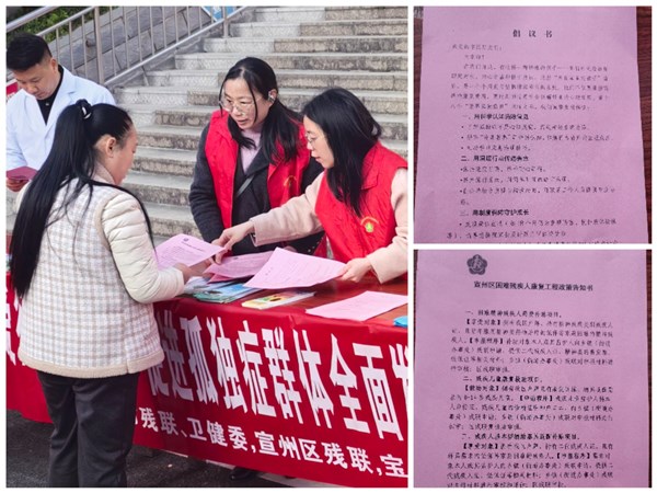 42日,宣城市殘聯、市衛健委和宣州區殘聯一起走進社區,向轄區居民、兒童家長發放倡議書和政策告知書,普及孤獨癥知識,提供現場咨詢和政策講解,積極營造關愛孤獨癥的社會氛圍。活動現場還就殘疾預防和殘疾人康復條例、殘疾人保障法、無障礙建設法和殘疾預防知識進行了宣傳。