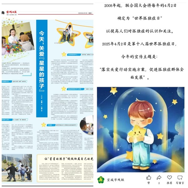 在孤獨癥日到來之際,宣城市殘聯、宣城日報社聯合開展科普宣傳,為社會公眾普及孤獨癥知識,反映孤獨癥患者困境,呼吁全社會共同關注、溫暖同行。市殘聯通過微信公眾號發布孤獨癥日科普知識,倡導“用科學消除偏見、用關愛守護成長”。