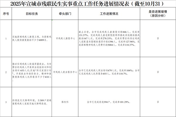 2025年宣城市殘聯民生實事重點工作任務進展情況表(截至10月31日)