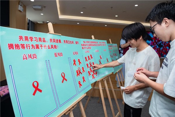 二是設置互動環節。活動通過“有獎競答”“危險地帶”“風險評估”等游戲,讓同學們在參與中掌握艾滋病核心知識。大家根據題板列出行為將紅絲帶粘貼至“無風險”“低風險”“高風險”區域,現場氣氛熱烈。